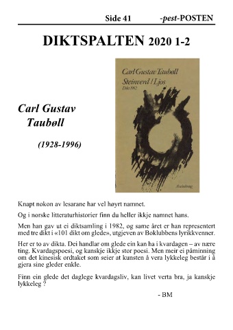 med tre dikt i «101 dikt om glede», utgjeven av Boklubbens lyrikkvenner.